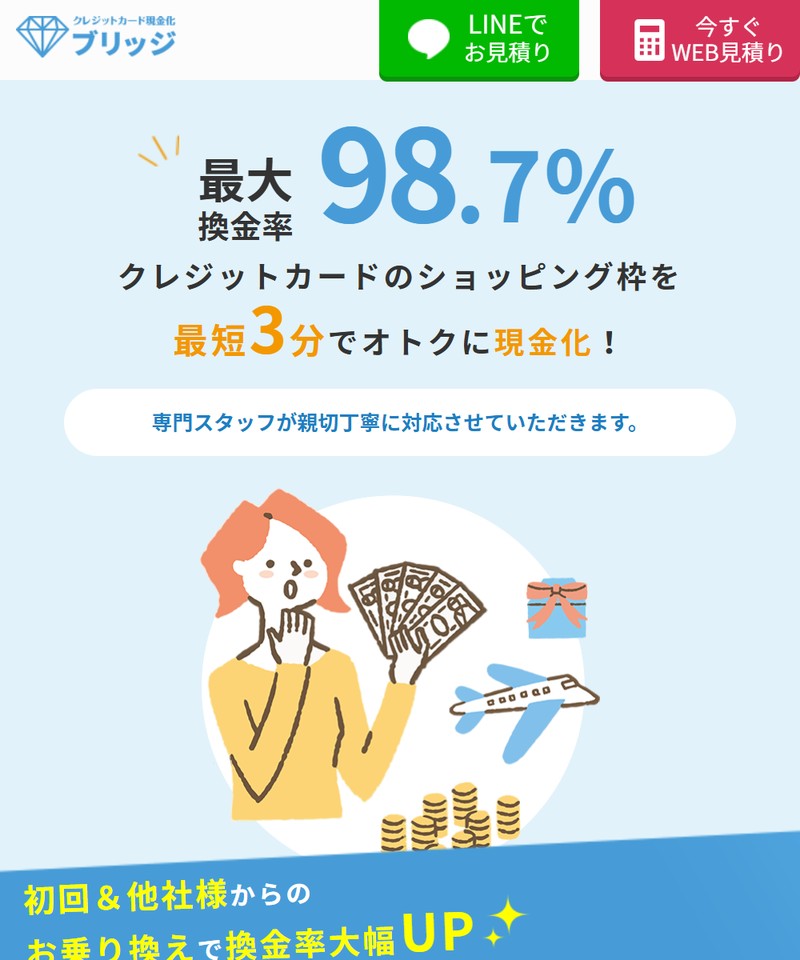 ブリッジは多くの現金化業者と比べても、最高レベルの換金率を誇っている会社であり、換金率が8割台を平均とする業者の中で異彩を放っているレベルなほど高いです。